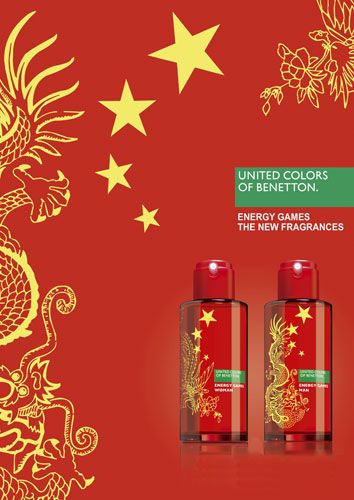 贝纳通(Benetton),其实它不应该列入奢侈大牌的行列,但是贝纳通进入中国市场时间之久恐怕是很多大牌无法毗及的。这次推出的充满中国奥运元素的喜动活力香水也颇有特色。 瓶子的玻璃柱形状,以华丽的红色作为背景,饰以两种强烈的中国文化象征图案:凤凰和龙。凤凰,古代传说中的百鸟之王,代表喜动活力女士香水。龙,一种神圣的吉祥物,长久以来令男性为它着迷,代表喜动活力男士香水。