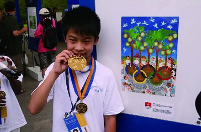 2008年8月8日,就在北京奥运会开幕式启动之前、在体育竞技赛场之外,奥运会的第一块金牌便由国际奥委会的官员颁发给了本届奥运会年龄最小的获奖者——来自香港的11岁儿童。当天,“Visa奥运畅想少儿绘画大赛”的全球决赛和金牌颁奖仪式,在北京朝阳公园“滨水之舟”广场举行,刘浚铭以他的绘画作品——“心连心,种出美丽梦想”赢得了全体评委的认同,荣获“2008年Visa奥运畅想少儿绘画大赛”的全球大奖。