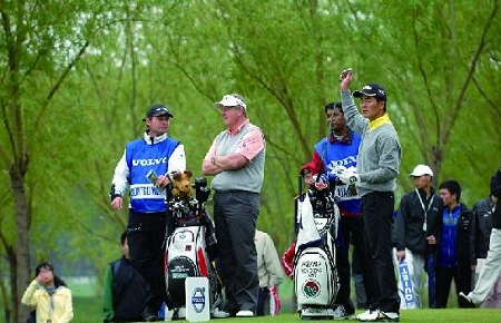 11:55分,当今中国头号高尔夫球手梁文冲来到2009VOLVO中国公开赛的发球台前。他不断地挥动着自己手里的球杆,并拿出球洞分布图站到发球台后,时而眯起眼、时而弯下腰观察开球线路,为开球做着最后的热身。刚刚还稍显空荡的球场此时已经吸引了数百名观众。尽管观看高尔夫比赛不允许大声喧哗,但还是有不少观众在窃窃私语。按照过去几年的经验,作为本土明星的梁文冲总是VOLVO中国公开赛的最大招牌。可眼看已到12点的开球时间,梁文冲却从发球台退了下来,现场观众也在不断回头朝球员练习场看去, “来了!来了!终于来了!”有观众小声喊道, “果然是大牌,掐着点来。”就在观众的议论声中,一个双手插在口袋里、身后跟着四名陪同的中年男子走进球场,顿时掌声雷动。梁文冲、卫冕冠军麦克米兰一起走上前去,跟他握手致意。这个人就是蒙哥马利,欧洲头号高尔夫球手,2010年莱德杯欧洲队队长,连续7年欧巡赛奖金王。