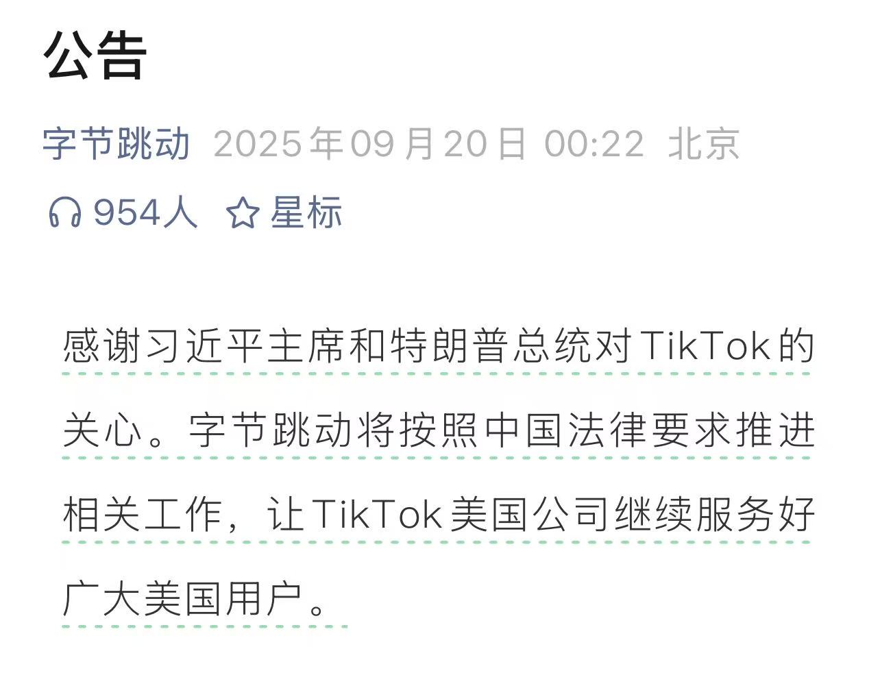 9月20日,字节跳动发布公告称,字节跳动将按照中国法律要求推进相关工作,让TikTok美国公司继续服务好广大美国用户。