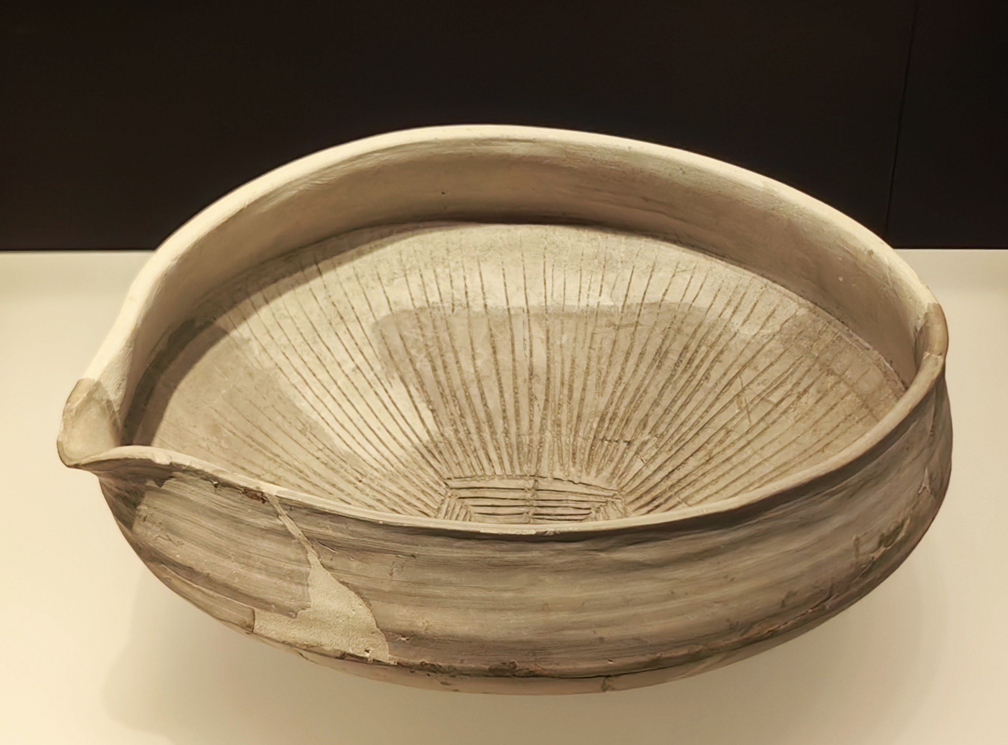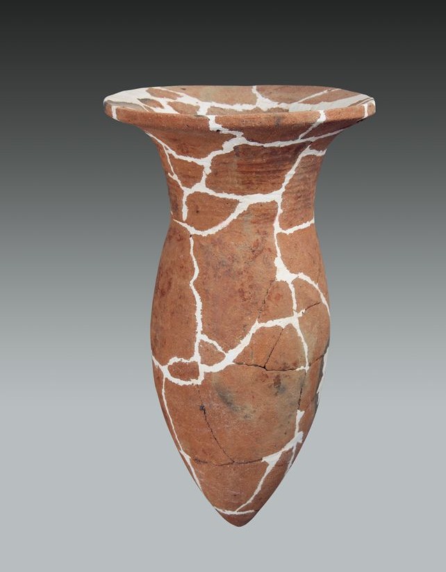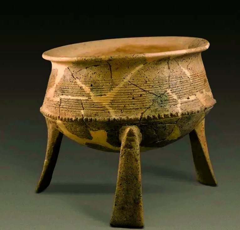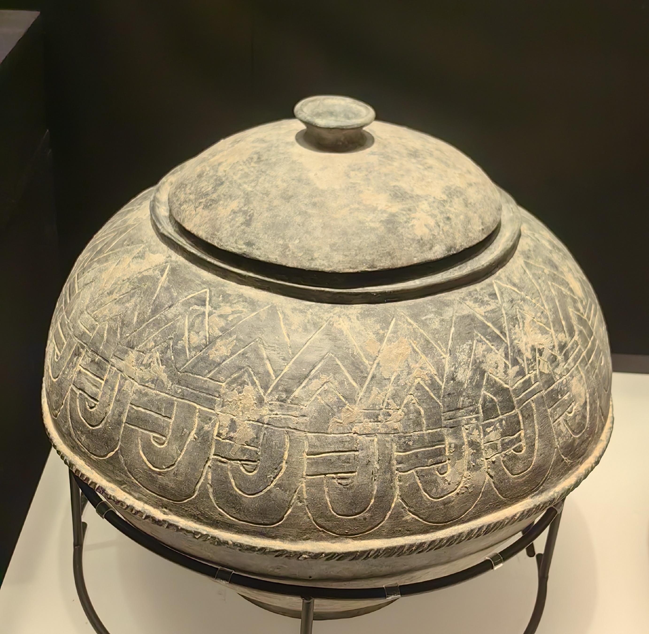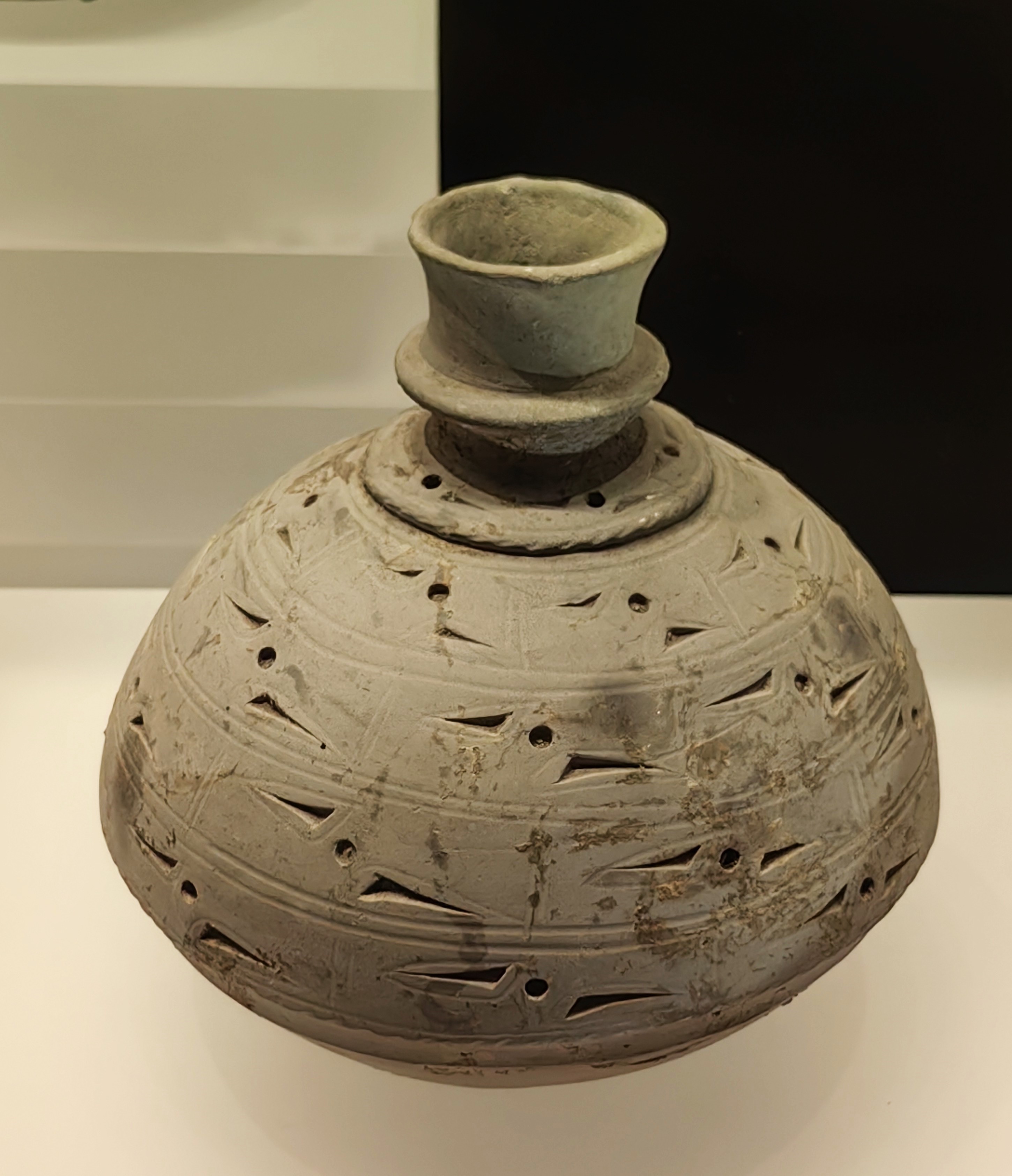 纹饰盛行压划编织纹、镂刻圆形和凹弧边三角形的镂孔,也有彩绘的红褐色宽带纹、波浪纹等图案,还有以锯齿形堆纹为饰的。