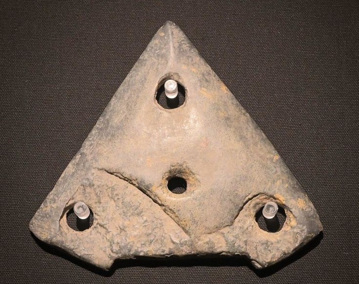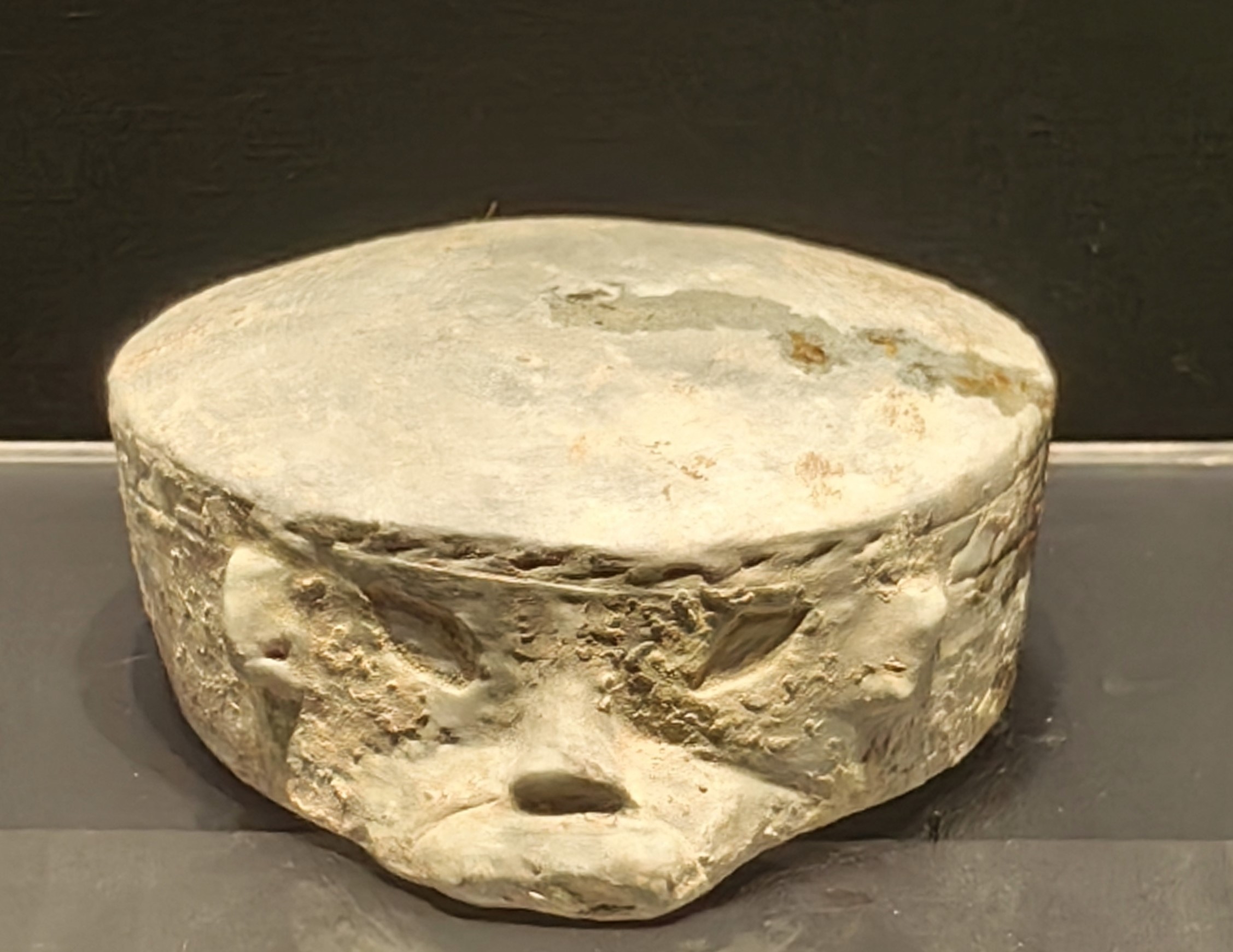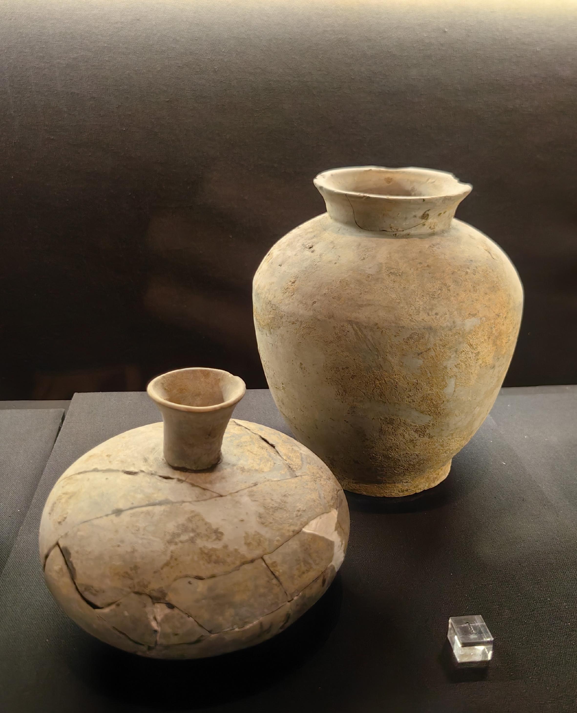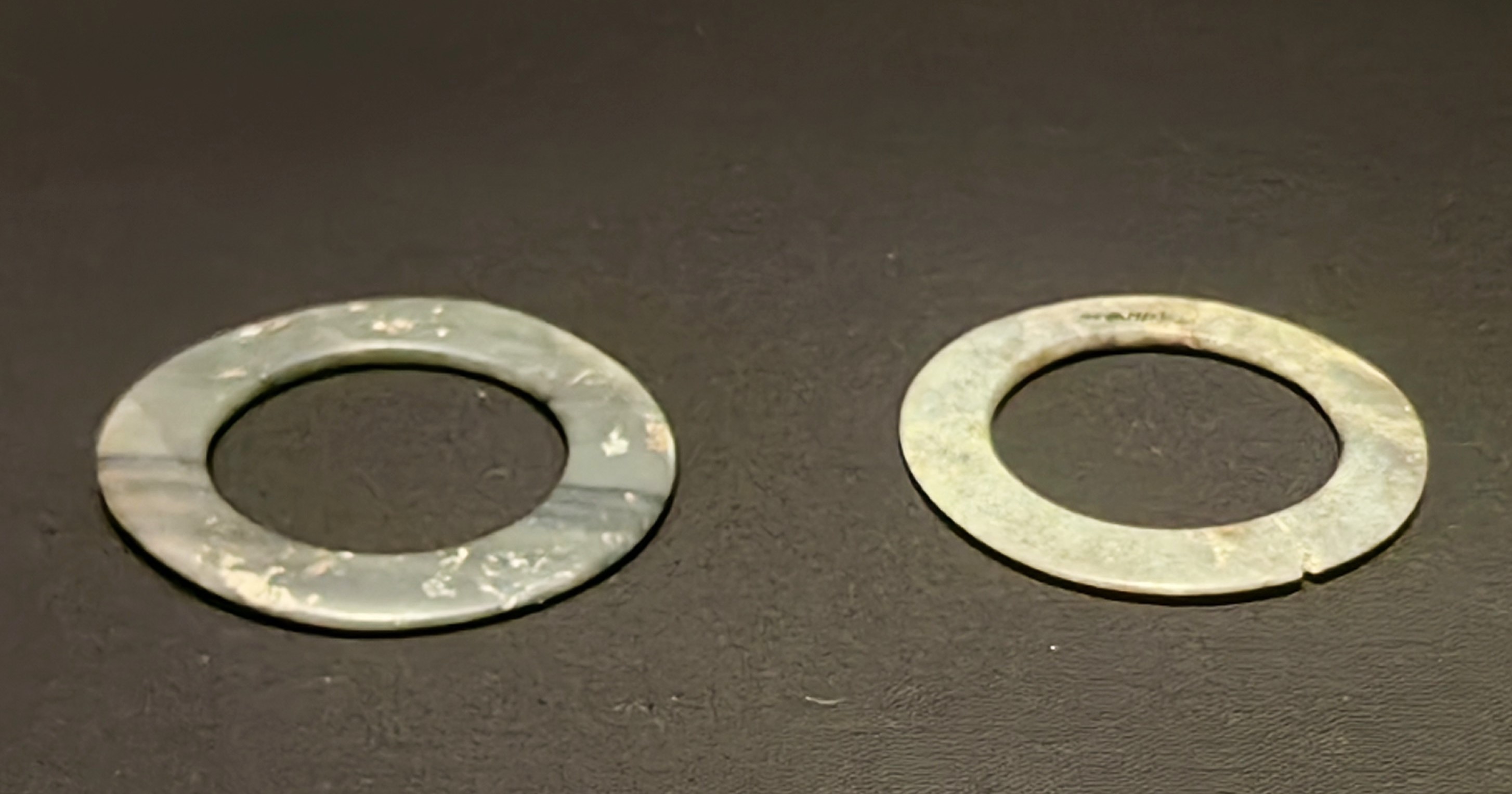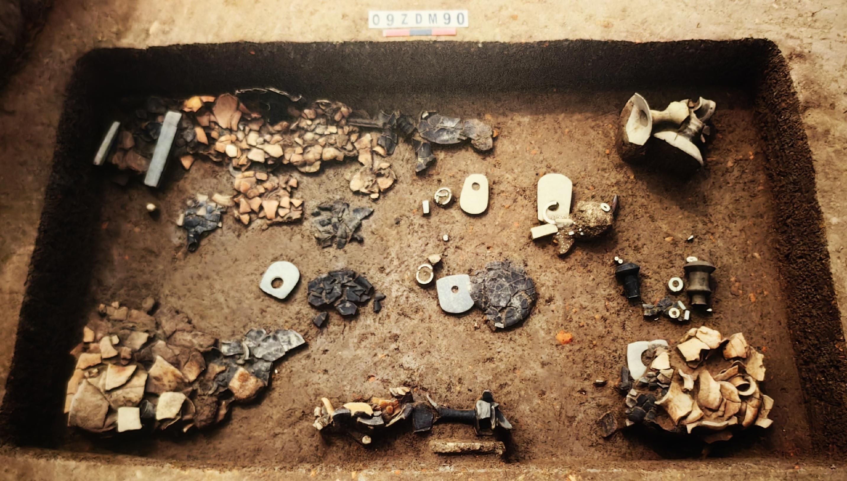 这些石钺磨制光滑,刃部未见使用痕迹,中间均有圆形穿孔,除材质不是良渚文化的软玉,形制已经与良渚文化的玉钺极为类似。一件石钺所在的土面上还有数道朱砂痕迹,推测这件石钺的圆孔两侧曾绘制有图案。这一随葬品规格,显示墓主人的身份很高贵。