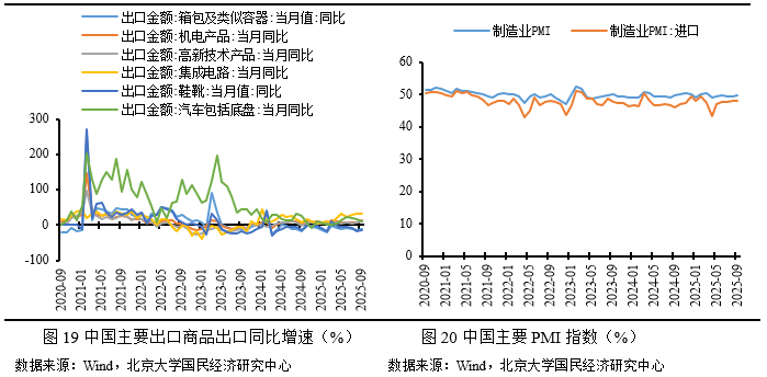 从国别出口看,9月中国对美国、欧盟、东盟出口额当月同比增速分别为-27.03%、14.18%、15.62%,分别较前期上涨6.09、3.79、-6.88个百分点。一方面,中国对美国的出口继续大幅下滑;另一方面,中国对大部分非美国家的出口继续保持高速增长。1-9月对共建“一带一路”国家及地区出口占比中国对外出口总额的50%以上,同比增长11.4%,高于全部出口额增速5.3个百分点;推算9月当月对共建“一带一路”国家及地区出口额同比增长19.8%,高于出口总额同比11.5个百分点。另外,本月对非洲、拉丁美洲的出口额增速也较前月大幅上涨,是推高本月出口额增速的主要因素之一。9月,对非洲、拉丁美洲出口额同比增长56.2%、17.5%,分别较8月上涨30.6、17.5个百分点。