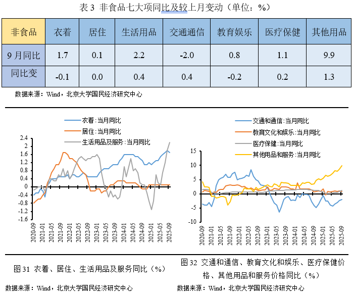 受居住及能源价格上涨带动,非食品价格止跌,其一,暑假结束,出行旅游继续减少,旅游价格季节性下降,环比增长-1.7%,较前月下降1.1个百分点;其二,受新装上市影响,服装价格季节性上涨;其三,“反内卷”效果逐渐显现,家用器具、通信工具价格均有上涨。总体而言,非食品项七大类价格环比分化(4正、2负、1持平),其中其他用品及服务价格环比幅度最高(1.3%),较上月环比变动分化(3正、3负、1不变),其中其他用品及服务价格环比变动最显著(1.3%)。