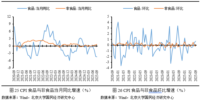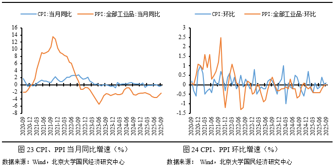 2025年9月,CPI同比增长-0.3%,较前月上涨0.1个百分点;环比增长0.1%,较前月上涨0.1个百分点,工业消费品价格增速上涨是推动CPI增速0.1个百分点上涨的主要因素。供给充足,CPI增速维持低位运行,尤其食品价格下降明显,是当前导致CPI同比负增长的主要因素。“反内卷”效应逐渐显现,部分消费工业品供给过剩问题或有缓解,工业消费品价格增速继续小幅上行,推动非食品价格增速继续上涨。