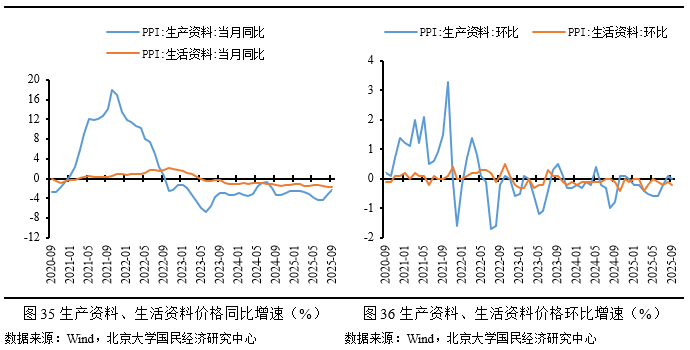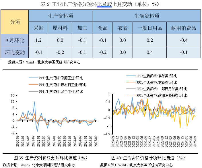 从同比看,9月PPI下跌2.3%,降幅较前月收窄0.6个百分点。受低基数效应、国际大宗商品价格下降的输入性影响,叠加“反内卷”国内优化市场竞争秩序的对冲,本月工业品价格增速继续上涨。生产资料价格同比下降2.4%,降幅较前月收窄0.8个百分点,其中采掘业、原材料、加工业价格同比增速分别上涨2.5、1.2、0.5个百分点;生活资料价格同比下降1.7%,与前月持平,其中耐用消费品价格降幅扩大0.2个百分点,而一般日用品价格降幅则收窄0.3个百分点。
