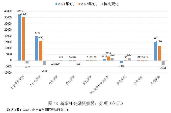 2025年9月新增政府债券融资达11893亿元,较2024年9月的15357亿元同比减少3464亿元,降幅22.6%。政府债券仍是社融增长的核心支撑,反映出财政政策在稳经济中的关键作用。9月专项债发行维持高位,资金投向基建和消费领域,与中央强调积极财政政策的基调一致。 尽管同比少增,但较8月的13658亿元调整有限,预计在应对外部关税压力的背景下持续发力。
