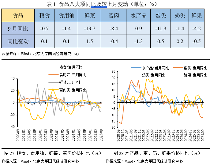 一方面,农业科技爆发叠加国内物流产业快速发展,保障国内食品供应充足,抑制食品价格上涨。2025年夏季以来,尽管极端天气频发,国内肉蛋、果蔬供给依然充足,价格走势平稳。另一方面,“反内卷”效应逐渐显现,居民部分消费工业品供给过剩问题或有缓解,工业消费品价格增速普遍小幅上行。因此,本月CPI同比增长-0.3%。剔除食品价格和能源价格的核心CPI同比增速,自2月份以来呈震荡上涨态势,9月核心CPI同比增长1.0%,较8月上涨0.1个百分点;1-9月核心CPI增长0.6%,较上半年上涨0.2个百分点。