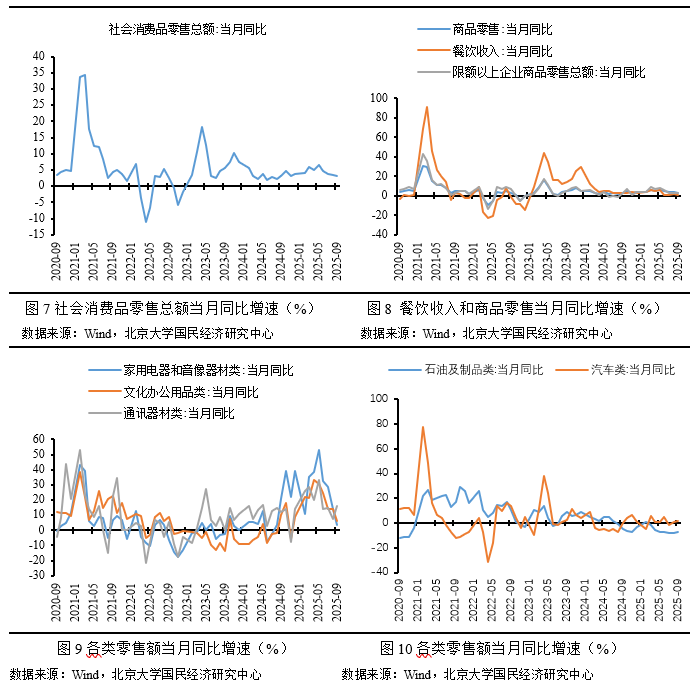 2025年9月,社会消费品零售总额同比增长3.0%,较前月下降0.4个百分点;前三季度,同比增长4.5%,较上半年下降0.5个百分点,“国补”政策微调,促消费政策效应未完全释放,叠加收入增速依然低位前行,收入、就业预期并未明显改变,整体消费额增速仍底部徘徊。