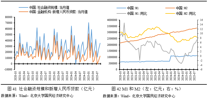 2025年9月末,M2余额为335.38万亿元,同比增长8.4%,较8月下降0.4个百分点,凸显货币供应扩张放缓但仍处于较高水平。M2的放缓得益于货币政策的适度宽松以及财政政策的协同支持,但季末信贷冲量后存款派生效应减弱。9月末M2增速小幅回落,主要受社融增速放缓影响,特别是近期政府债券融资规模调整,但财政支出带动存款派生仍支撑。 此外,9月作为季度末,新增贷款12900亿元的反弹得益于政府债券发行提速和财政支出增加,但实体经济中长期融资需求仍显结构性疲软,居民和部分行业存款增长有限。