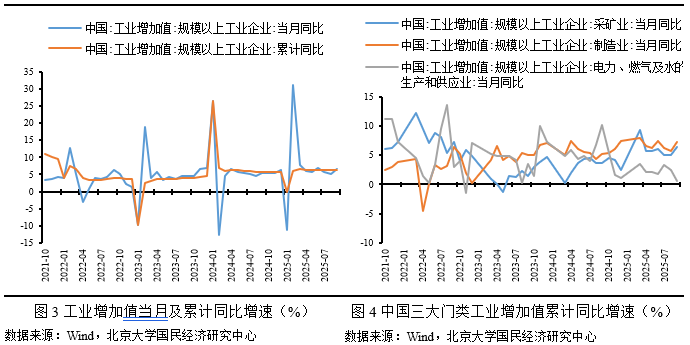 工业增加值方面:2025年9月,中国规模以上工业增加值同比实际增长6.5%,较8月上升1.3个百分点,累计增长6.2%,持平于8月。这一增速高于市场预期,创三个月新高,主要受制造业订单改善和政策传导效应推动,但较上半年平均水平仍显波动。制造业和高技术产业表现突出,凸显中国工业向高质量转型的韧性。然而,全球需求不确定性和房地产投资持续低迷对增长构成制约。