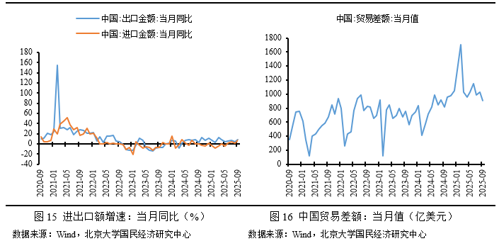 出口方面,2025年9月,出口总额3285.7亿美元,同比增长8.3%,较前月上涨3.9个百分点,本月出口结构变化继续,全部出口额增速继续震荡。国别方面,中国对非美国家出口额增速继续震荡上涨,尤其是对共建“一带一路”国家、非洲、拉丁美洲出口额增速本月大幅上涨;具体出口商品方面,传统低附加值商品出口加速下降,技术含量较高商品的出口则继续增长,尤其是对集成电路、集成电路出口额继续高速增长。