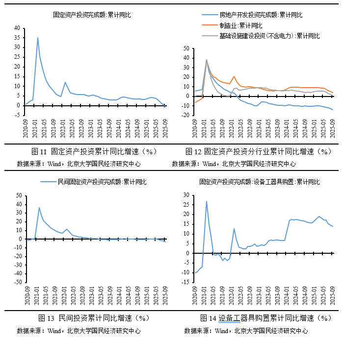 政策调整叠加房地产产能去化继续,投资增速超预期下滑。5月20日在发改委新闻发布会上,发改委发言人李超应新华社记者提问,就整治“内卷式”竞争的相关问题做了详细的阐述。早在3月《2025年政府工作报告》中指出“加快建立健全基础制度规则,……,综合整治‘内卷式’竞争”。6月29日,人民日报头版发文《在破除“内卷式”竞争中实现高质量发展》,进一步将“反内卷”引发了各界的关注,也释放了政策调整的信号,阶段性抑制投资。受预期及政策方向调整的影响,1-9月固定资产投资增速较1-8月全面下滑。另外,房地产产能去化继续,房地产投资降幅进一步扩大,进一步拉低全部投资增速。