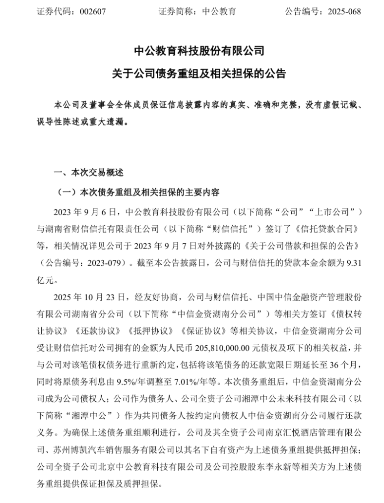 根据公告,截至披露日,中公教育与财信信托的贷款本金余额为9.31亿元,经协商,财信信托将其持有的2.058亿元债权转让给中信金资湖南分公司,还款期限延长至36个月,原债务利息由9.5%/年调整至7.01%/年。