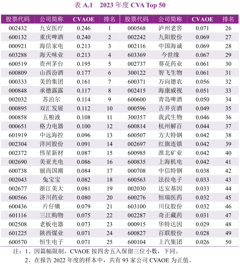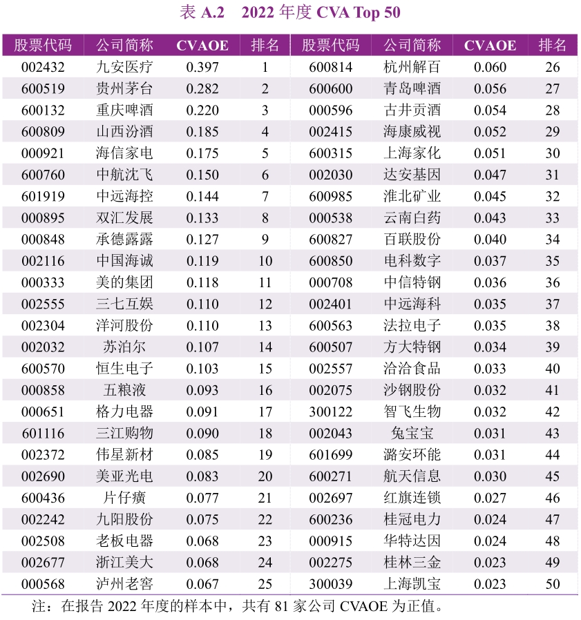 在经过上述4个标准筛选出的上市公司样本中,研究团队遵循谢德仁(2021)所提出的、具有原创性的指标净资产自由现金流量回报率(FCFOE)的基本逻辑来测算一个新的、具有原创性的指标净资产现金增加值回报率(Cash Value Added on Equity, CVAOE),然后基于该指标进行样本公司-年度观测的排序,最终确定榜单各个年度的CVA Top 50名单。