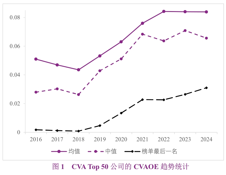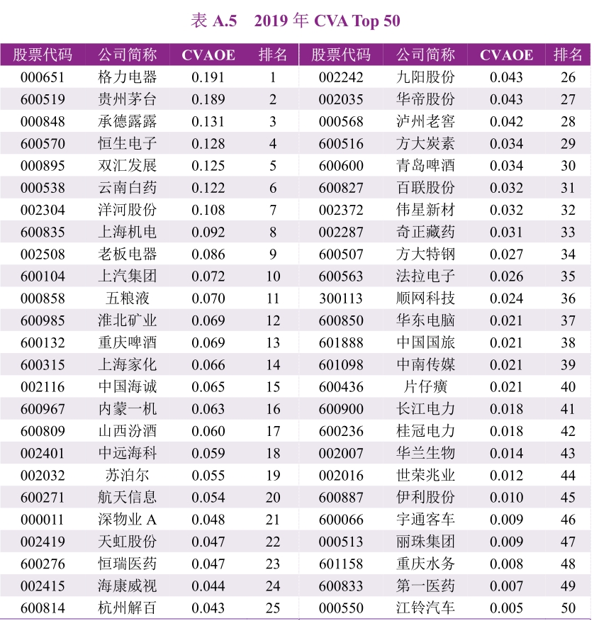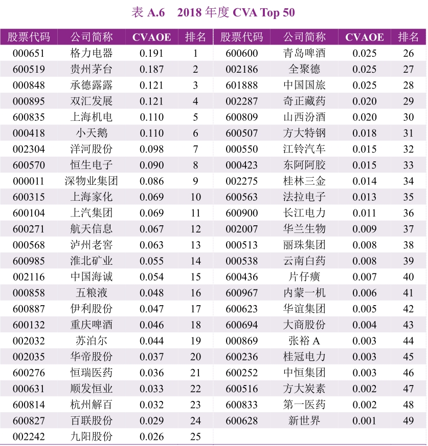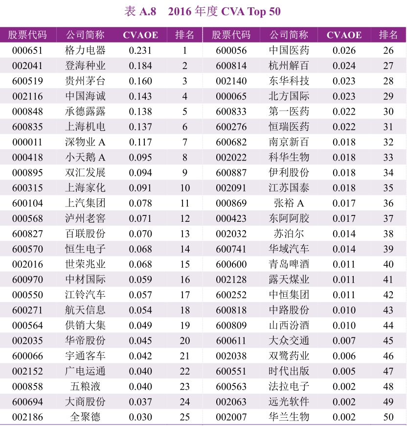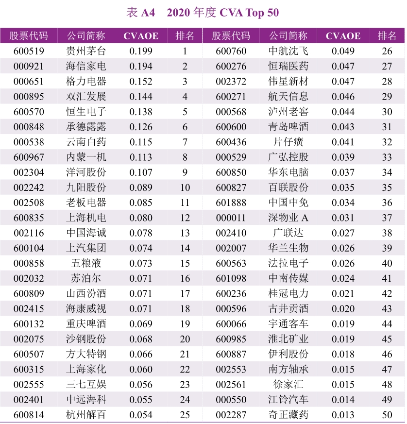 需指出的是,类似于经济增加值,现金增加值作为一个考核指标,其自身应该是绝对的规模越大越好,如经济增加值要求企业规模扩张到边际利润等于边际股权资本成本为止,故本不应该采用其相对于净资产或者总资产的回报比率进行考察。但是,本报告的目的不是为了前瞻性地测算企业的现金增加值的绝对规模,而是回溯企业的历史,观察企业在历史上利用股东所提供的资本(净资产)而创造的现金增加值之多寡,以从现金增加值视角反映企业实际的股权资本利用效率和股东价值创造能力,为此,可以计算CVAOE,并基于之来分析企业的股东价值创造能力和进行榜单编制。