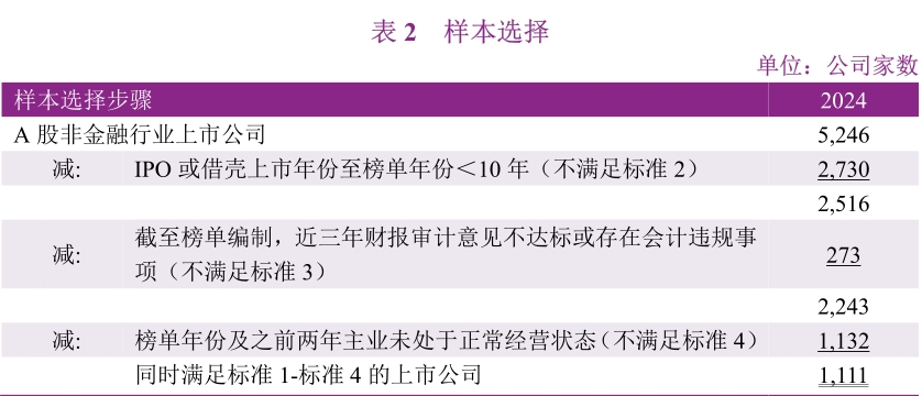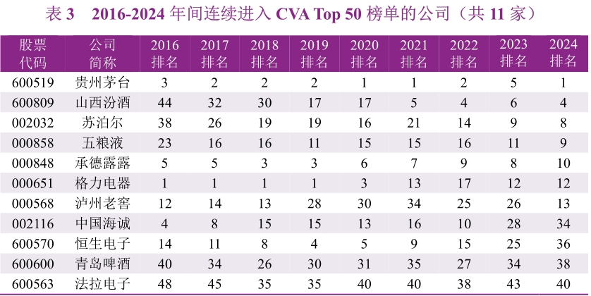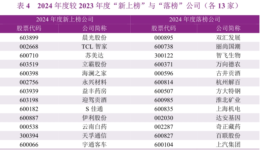 较之2023年度,2024年度“新上榜”的公司主要由如下原因所致:①2023年度未满足标准2,但2024年度已满足,即计算口径年份恰好满10年,主要有永兴材料、天孚通信、海澜之家、迎驾贡酒、立霸股份、晨光股份、益丰药房;②2023年度存在审计非标意见,但2024年满足所有标准,有TCL智家、S佳通;③其余公司均因名次相对上升而入榜。