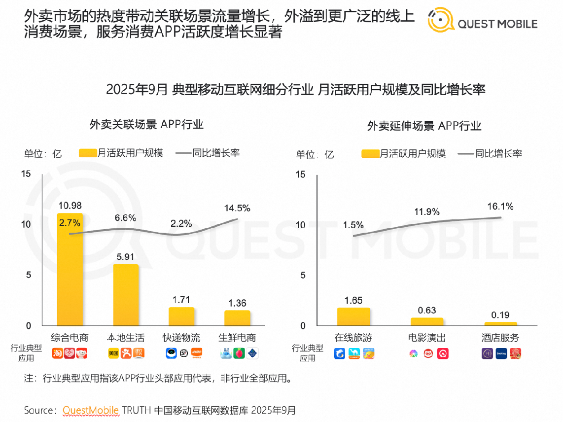 外卖市场火热还带动关联场景APP流量增长,同时延伸至旅游、演出、酒店等更广泛的服务消费场景。9月,电影演出、酒店服务相关APP月活同比增长分别达11.9%、16.1%。