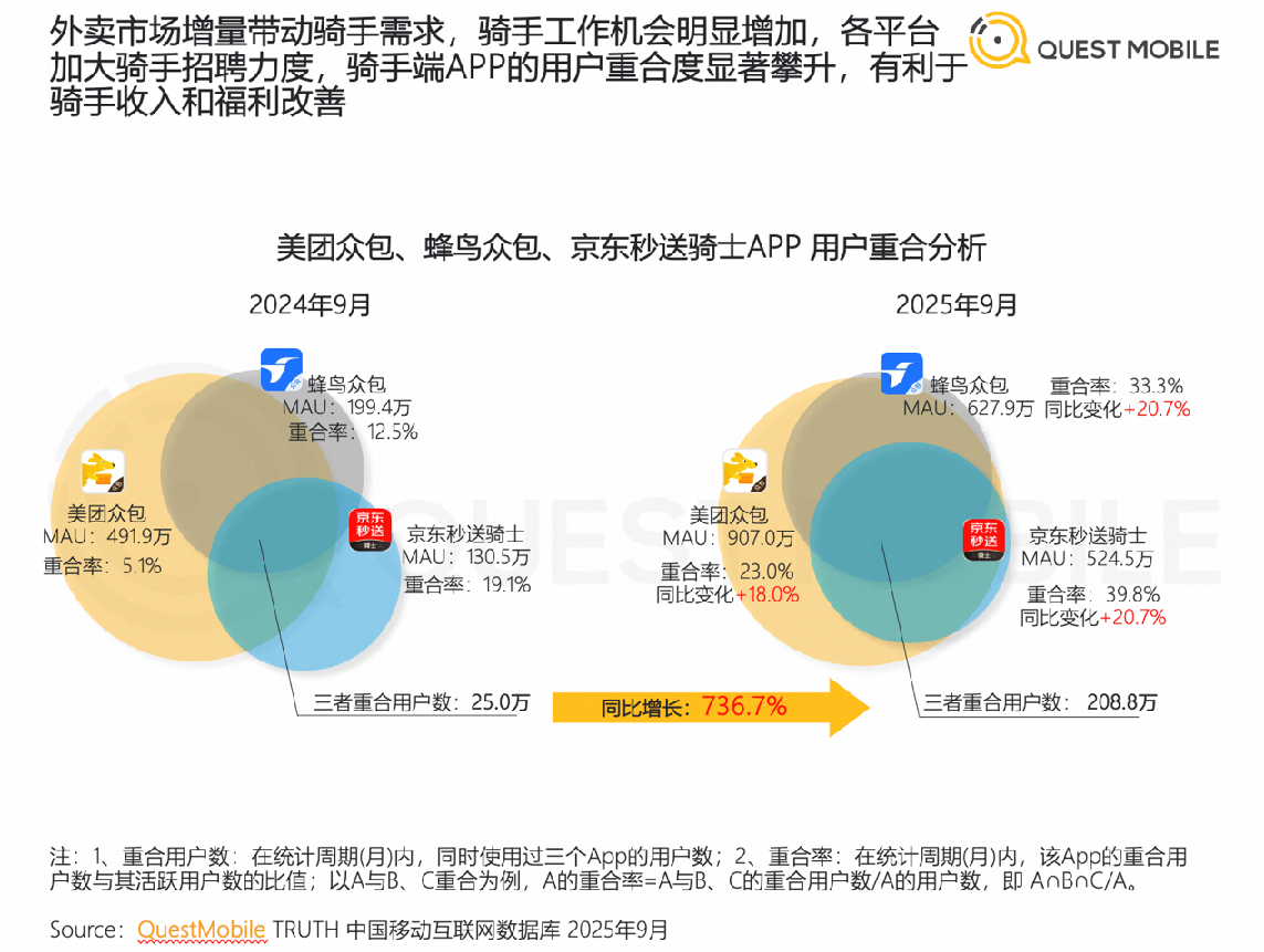 骑手规模迅速扩大,亦呈多平台接单趋势,工作机会增加,有利于骑手收入和福利改善。7月和8月,骑手端APP整体月活跃用户皆超过1400万,较1月增长140%以上;平台加大骑手招聘力度,9月,美团众包、蜂鸟众包、京东秒送骑士月活跃用户重合度同比增长超7倍;美团众包与其他骑手平台间徘徊用户,即同时使用美团众包及其他任一骑手平台的活跃用户,规模扩大且涨幅明显,其中与蜂鸟骑士间徘徊用户超过400万,徘徊用户占比达45%,同比增长18.5%。