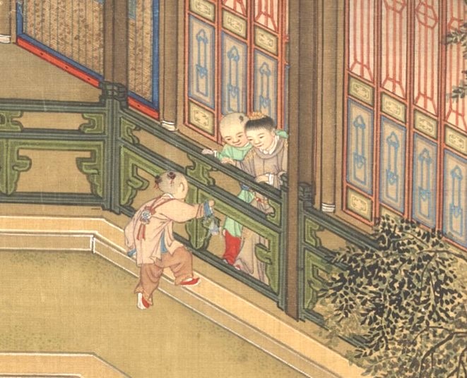 值得一提的是,古代孩子们会在肘臂或是袖中佩戴一个香囊,起到稳定心绪、祛疫治病或是装饰衣物的效果。《礼记·内则》注曰:“容臭,香物也,助其形容之饰,以缨系之。”这被认作香囊最早的形态。图中三个童子正在玩耍,其中一个梳着总角发式的孩童,迈过台阶,好像要翻过护栏,他的背后带着一个独特的香囊。这种香囊又称“长命缕”,属于端午节时的厌胜佩饰,有避邪祈福的寓意。