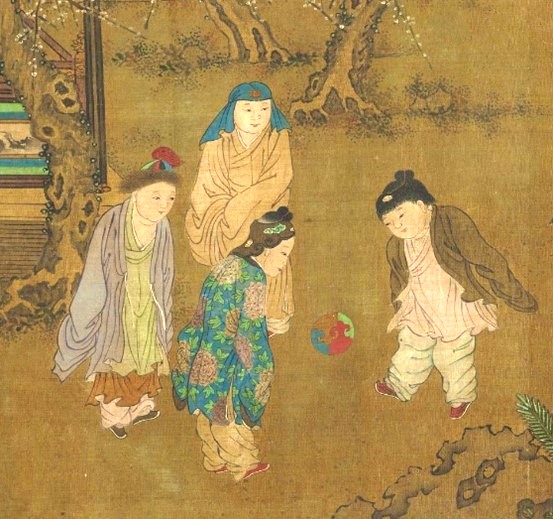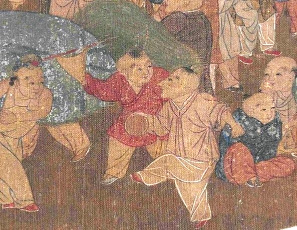就在舞狮队伍的旁边,一个小朋友右手微举一球状物,左脚向前,仿佛要将这个球踢向远方。在他旁边,一位红衣小伙伴兴奋地抬起头,举手为其加油助威。这项类似于足球的运动,古代叫蹴鞠。据史料记载,蹴鞠发明于战国时期,到了唐宋,蹴鞠已是一项十分火热的运动,社会各个阶层都参与到了这项运动当中来,自然也是孩子们平日玩乐的重要活动。