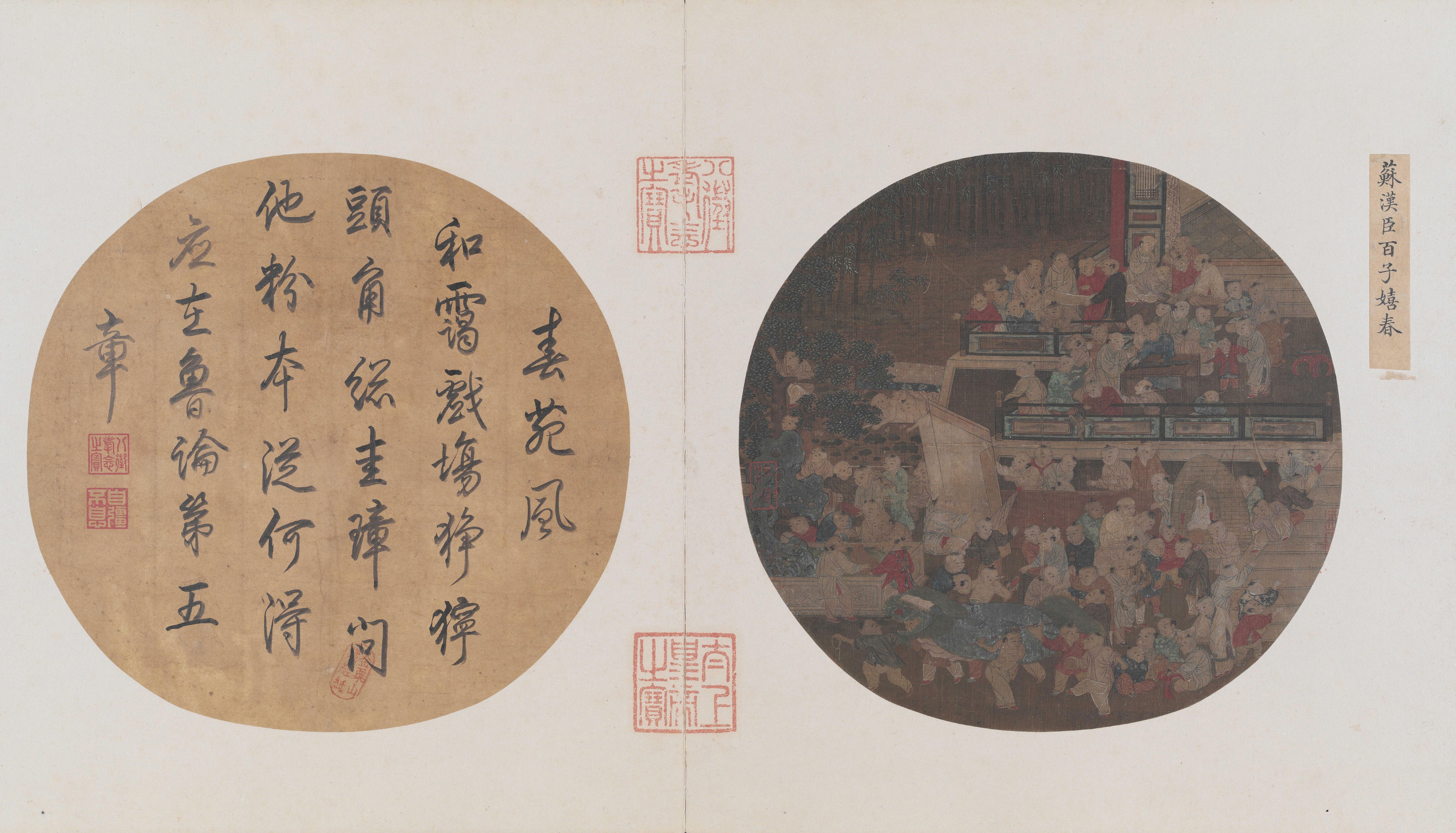 “春苑风和蔼戏场,狰狞头角总圭璋。问他粉本从何得,应在鲁论第五章。”这是乾隆在欣赏百子嬉春场景时题下的诗句,意思是春天的庭院中风和日丽,戏场中气氛也欢乐。那舞狮头上狰狞的角总是如同贵重的玉器般珍贵。若问这样的画稿从何而来,应该是来自于《论语》教化中所蕴含的君子之礼。在乾隆眼中,孩子们是朝气和活力的化身,拥有着无限的纯真与无尽的欢乐。聚会当中的各种游戏不仅仅是玩乐,更是一种社交与学习的方式,孩子们通过这些聚会,彼此建立友谊,学习礼仪与智慧,有欢愉,也有成长。