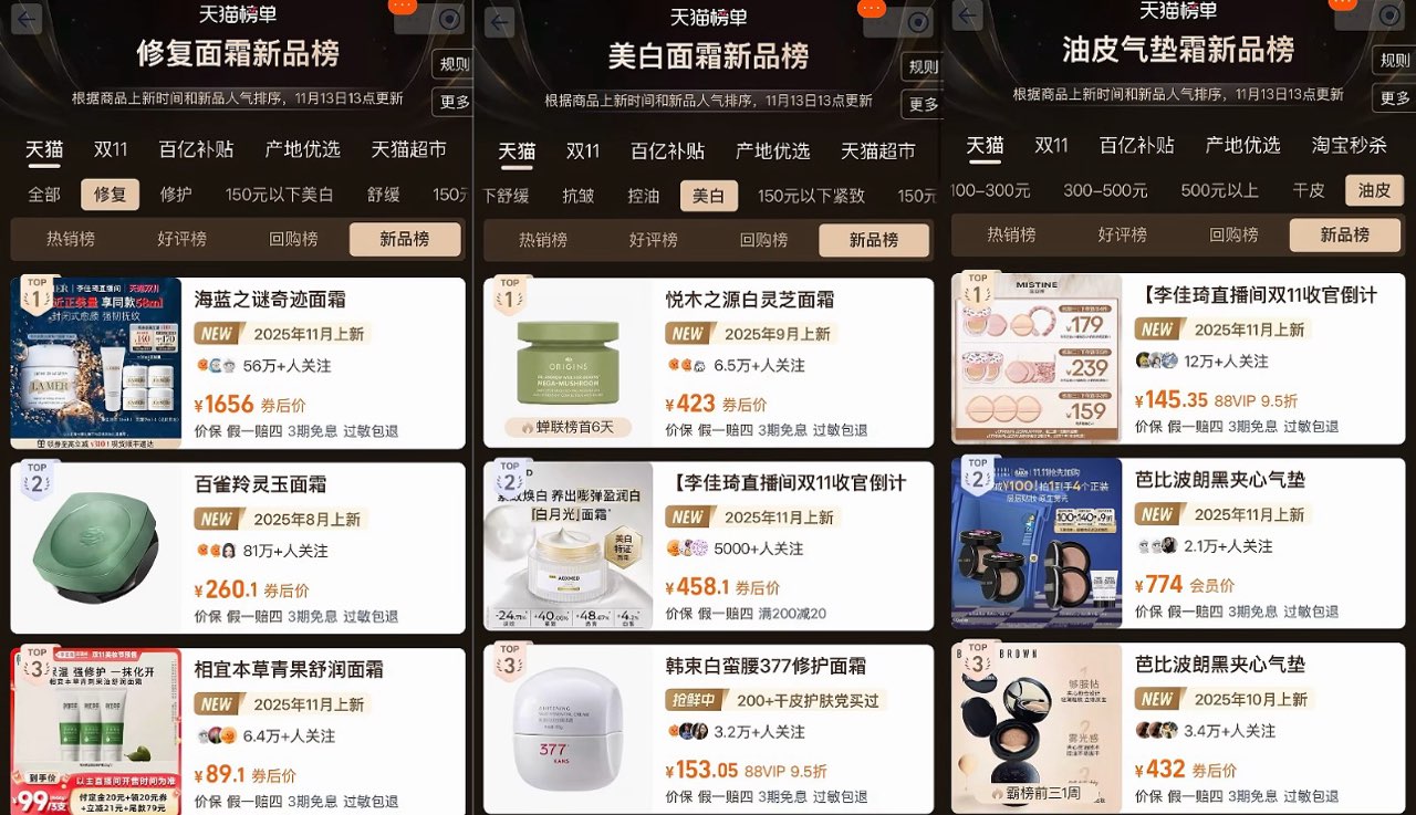 笔者从李佳琦直播间获悉,在本年度双11期间,新品表现亮眼,美妆、消电、宠物等多个品类的新品在直播间完成从亮相到爆款的跨越。其中,百雀羚灵玉面霜、函得仕胶原发膜、同频澄净次抛在众多新品中热度位列前三,甚至登上天猫榜单相关类目前列。