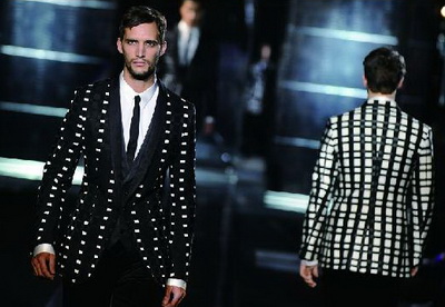 同样抛弃了自己在08年的中性性感风格的还有DOLCE&GABBANA。两位设计师为这场时装秀挑选了“blackandwhiteimagesofSicily”(西西里岛的黑白影像)作为秀场背景,音乐则为80年代的后朋克乐队TheKillers的歌曲“HUMAN”——显然,80年代的西西里男人形象成了这对设计师呈现心中英雄的参照系:三件式的套装,搭配科波拉花呢扁帽,以及昂贵的鳄鱼皮手提箱,最后再穿上一件黑灰呢大衣。就款式的选择和色彩的运用来说,这个系列实在是平实无奇,但DOLCE&GAB-BANA却在细节上下足了功夫,细看就会发现,西服之上原来还盘着精致花纹以及极富编织感觉的编织纹西装,质感立刻被凸显出来了,加上模特手中的亮色丝巾,十足的意大利风格。