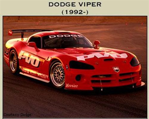 Viper是过去25年内美国品牌跑车的典范。拥有大的可笑的发动机(8.3升V10发动机)和超过任何人所需的马力(500马力),Viper具有难以置信的诱人前端设计。也使得他逐年得到完善,更加文明也更加舒适,即使他还和现在的福特SVT野马眼镜蛇拥有相似之处。