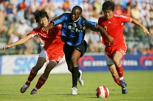 下半时双方易边再战,国际米兰换上了阿德里亚诺、索拉里、萨姆埃尔等大牌球星,国奥队也进行了人员调整。双方的攻防转换节奏明显加快。第52分钟,刚上场的阿德里亚诺左路得球,在大禁区线上完成了自己的第一脚射门,球偏出右立柱。第54分钟,阿德里亚诺接索拉里的后场传球,禁区内戴琳和万厚良二人关门都未能防住其突破,阿德面对王大雷一脚大力射门球高出横梁。