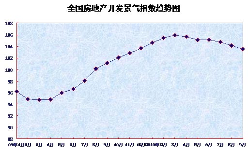 9月份,全国房地产开发景气指数(简称“国房景气指数”)为103.52,比8月份回落0.59点,比去年同期提高2.44点。