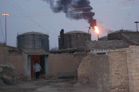 1月11日,距离兰州石化爆炸过去后4天,工厂已经恢复生产,兰化的火炬已经点燃,巨大的烟囱在向外排放有毒的废气。石岗村5社一名村民的家与兰州大乙稀球灌区仅一墙之隔。