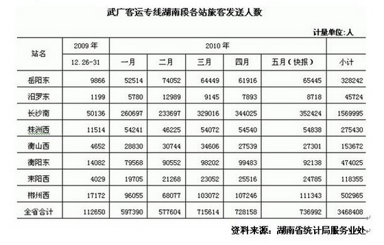 记者 谢良兵 近日,本网记者从湖南省统计局服务业处获悉,武广高铁自2009年12月26日开通运营以来,截止到今年5月共输送旅客3468408人次。以客流量计,位居前三的站点为长沙南站、郴州西站和衡阳东站。