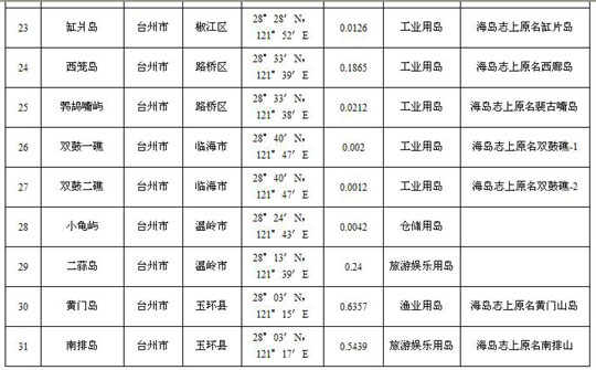 其中,绝大部分的岛是旅游娱乐用岛,在国家海洋局网站上公布的名录中,只有17个岛是工业用岛(不含交通与工业用岛),还有竹岐山、倪礁、独山背岛三个岛是城市建设用岛。