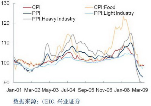 兴业证券首席宏观分析师董先安认为,剔除季节因素,物价环比趋势平稳。CPI、PPI走势表明中国经济成功走出通缩阴影。春节期间CPI出现03年以来首次同比负值,但当时环比已经平稳,过了环比趋势负值高峰阶段,当时PPI环比也比08年11月的-3.4%大幅回升。当时从环比来看,中国已率先呈现走出通缩迹象,并预期8月前后CPI能变为正值;到年底国内PPI和CPI同比都将出现正增长。