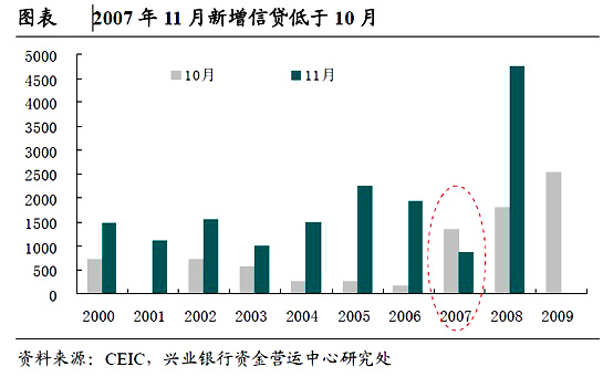 兴业银行的最新报告显示,从2000年至2008年这9年之间,只有2007年的11月新增贷款低于10月份。