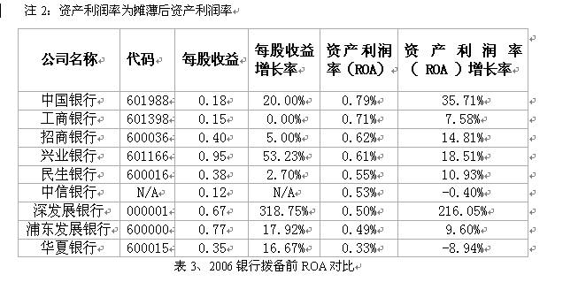数据显示,06年除工商银行营业收入增长7.99%外,其余8家银行营业收入均保持了两位数的增长速度。从表1可以看出,与2005年相比,两家上市国有商业银行2006年的净利润增长率均超过了其营业收入增长率,显示出了改制成效。除了招商银行还未披露年报外,民生银行、兴业银行、浦法银行的净利润增长也都超过了营业收入的增长,表现出比较强劲的盈利能力,而华夏银行净利润增幅则小于营业收入增幅,例外的是深发展银行,由于拨备计提远远低于其他银行,其净利润的增长显得过于“迅猛”。