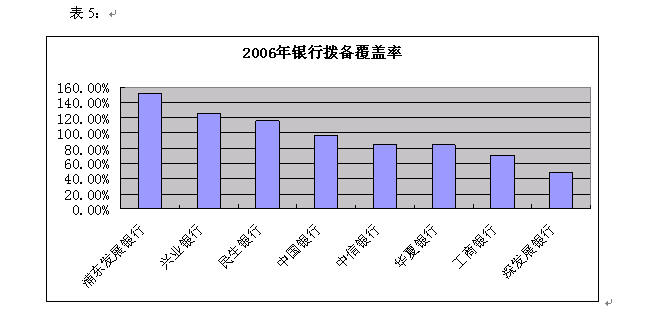 值得注意的是,在资产增加的同时,浦发银行和民生银行的不良贷款绝对值都有所上升,浦发银行的不良贷款从05年的74.44亿元上升到06年的84.40亿元,民生银行的不良贷款从48.28亿元上升到06年的55.02亿元。有意思的是,虽然民生银行的不良贷款绝对值有所增加,但在目前披露年报的银行中,仍是不良贷款率最低的银行,而深发展银行则以7.99%的不良资产率“高居榜首”,深发展净利润高速增长的主要动因来自于相较于同类上市公司较少的计提贷款损失准备。2006 年度公司拨备覆盖率由43%上升到48%,但和其他股份制银行超过100%的拨备覆盖率仍相去甚远。如果深发展2006 年末将自己的拨备覆盖率提到55%左右,公司的净利润将和去年持平,300%多的净利润增速化为乌有。由此可见,高达319%的净利润增速有很大一部分是因为公司较为“激进”的计提拨备方式所致。