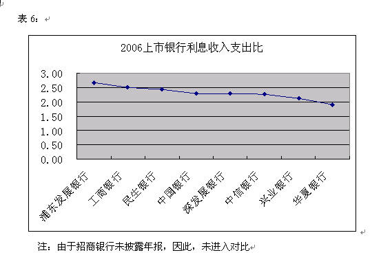 受06年银行利差扩大,各银行利差均比05年有不同程度的增长,从横向比较看,如果按利息收入支出比来评价银行利差的话,浦东发展银行和工商银行利差较高,表明其存贷款获利能力较高,而兴业银行和华夏银行则位居后列。