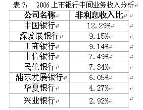 值得注意的是,排名最后的兴业银行2006年非利息收入占比同比减少7.54%,在总净收入中的占比下降到2.92%,在非利息收入中,手续费及佣金收入仍然保持了较快的增长,但公允价值净损益的减少以及其他业务净损益增速减缓拖累了非利息净收入的增长。