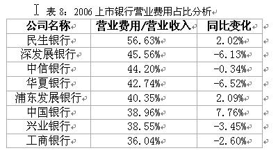 虽然06年大部分银行都在进行营业网点的扩张和对中间业务的投入,但营业费用占营业收入的比率月增加的不明显,特别需要注意的是,民生银行营业费用占比较高,并比05年增长了2.02%。深发展银行、中信银行、华夏银行虽然营业费用绝对值都有较高增长,但却低于营业收入的增长速度,其营业费用占收入反而有所下降。2006年全年中国银行费用控制效果显著。其中虽然员工费用306.77亿元,较上年增长27.93%;但业务费用172.83亿元,仅比上年增长9.79%。而浦东发展银行的员工费用大幅增长43.7%,直接导致了营业费用占比的上升。