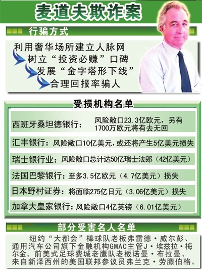 作为历时十多年之久的庞兹骗局的操纵者,麦道夫的受害者包括对冲基金、犹太人慈善组织以及世界各地个人投资者,遍布半个地球。2007年,美国第12次年度计算机犯罪和安全调查显示,金融诈骗是导致大量财政损失的原因。而在金融危机爆发后,美国众议院甚至专门立法打击金融诈骗,类似麦道夫这样的骗子被认为是引发金融危机的起因之一。