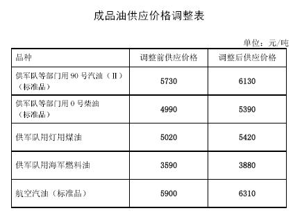 成品油生产经营企业供军队及新疆生产建设兵团、国家储备用汽、柴油(标准品,下同)供应价格每吨均提高400元,调整后的汽、柴油供应价格分别为每吨6130元和5390元。其他成品油价格相应调整。调整后的成品油标准品价格见附表一。非标准品价格由成品油生产经营企业按照国家规定的品质比率确定。