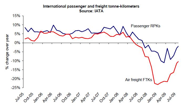 国际航协(IATA)对2005年-2009年国际客运和货运的运输能力的统计