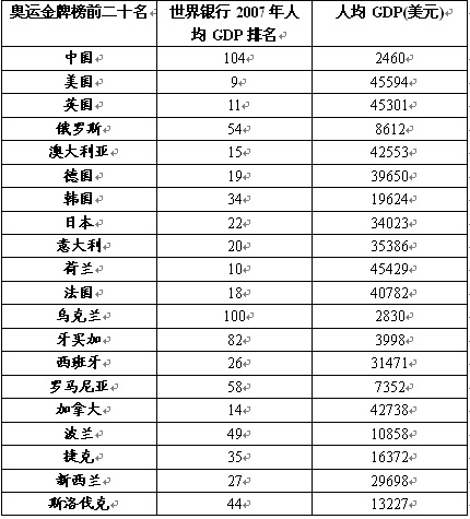 继续研究世界银行公布的2007年全球人均GDP排名,还可以发现不仅是美国、英国,在前二十的国家里面,还有澳大利亚、德国、意大利、荷兰、法国这五个国家也同样出现在此次北京奥运金牌榜的前二十名的榜单中。虽然说GDP不决定一切问题,但这些国家在提高人民运动水平上的投入,看来是真管用了。